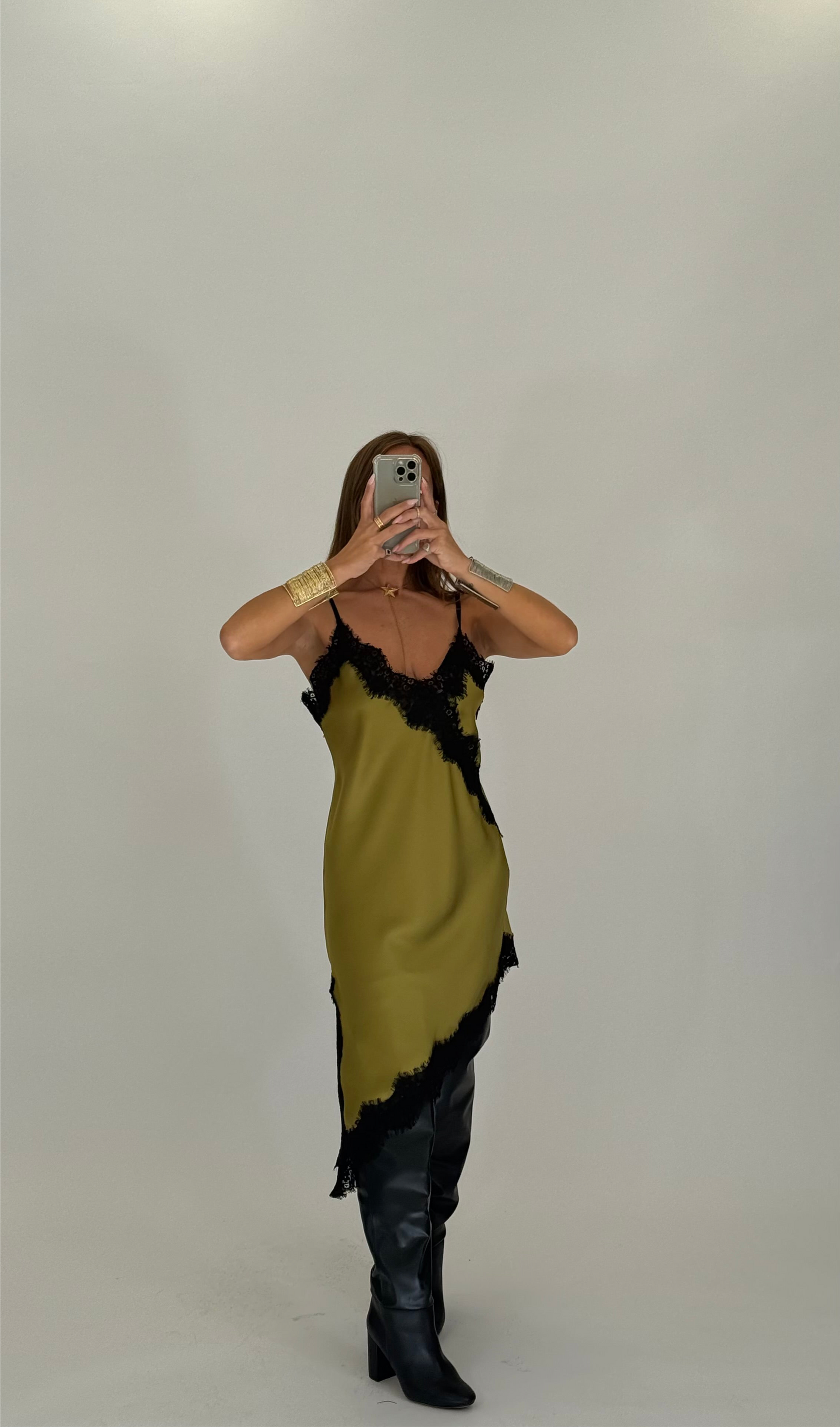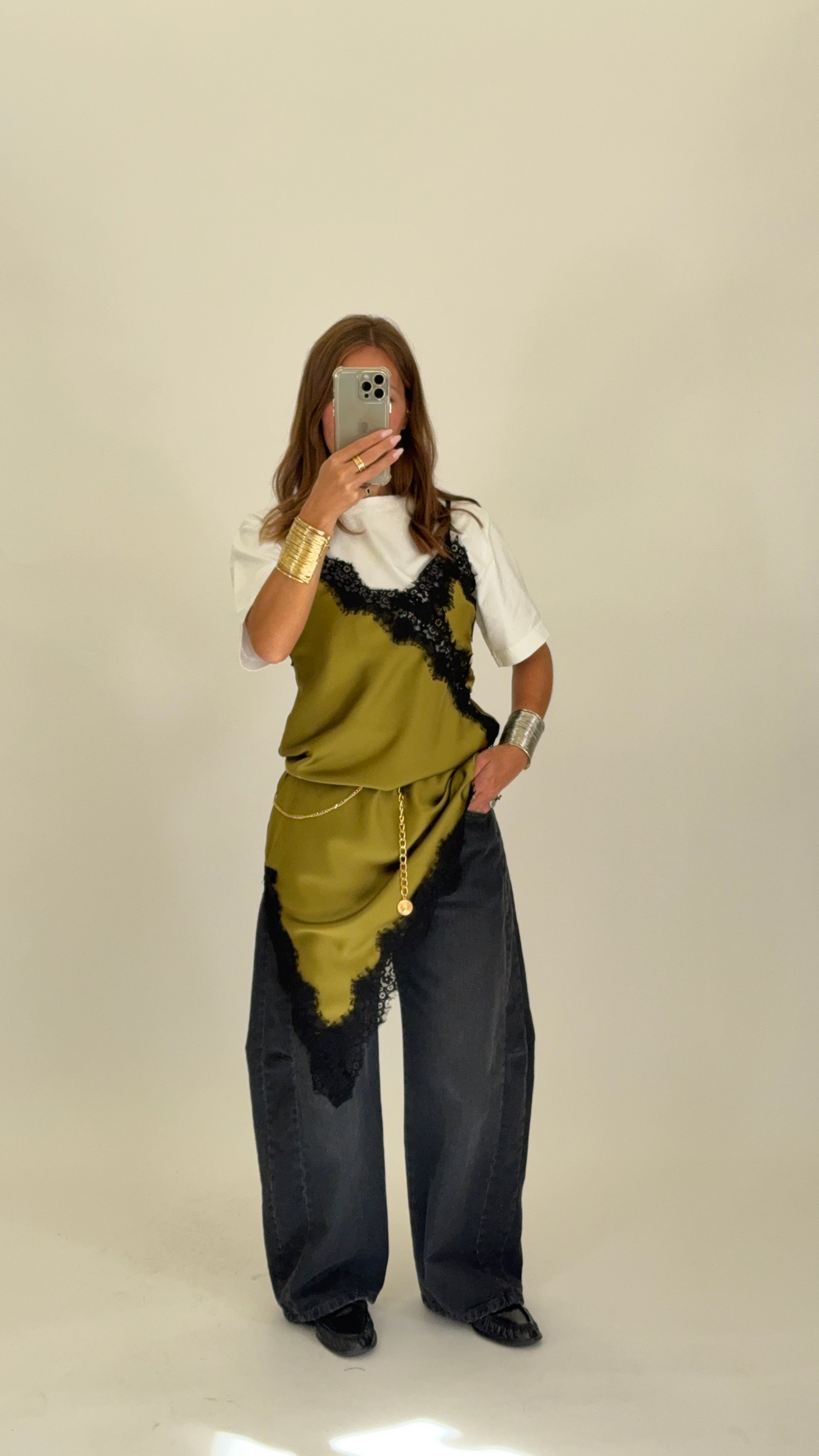 - HAVEONE MADE IN ITALY. Abito asimmetrico con contrasto di pizzo nero, bretelle regolabili