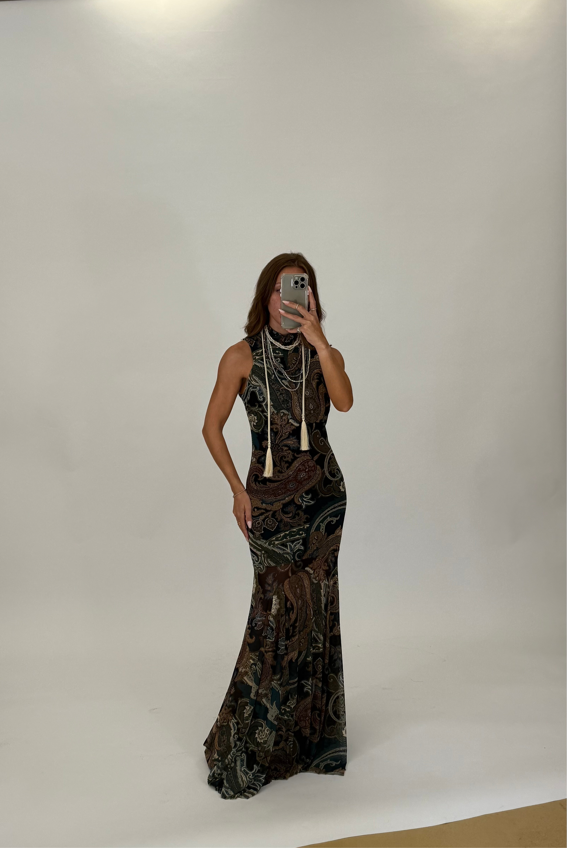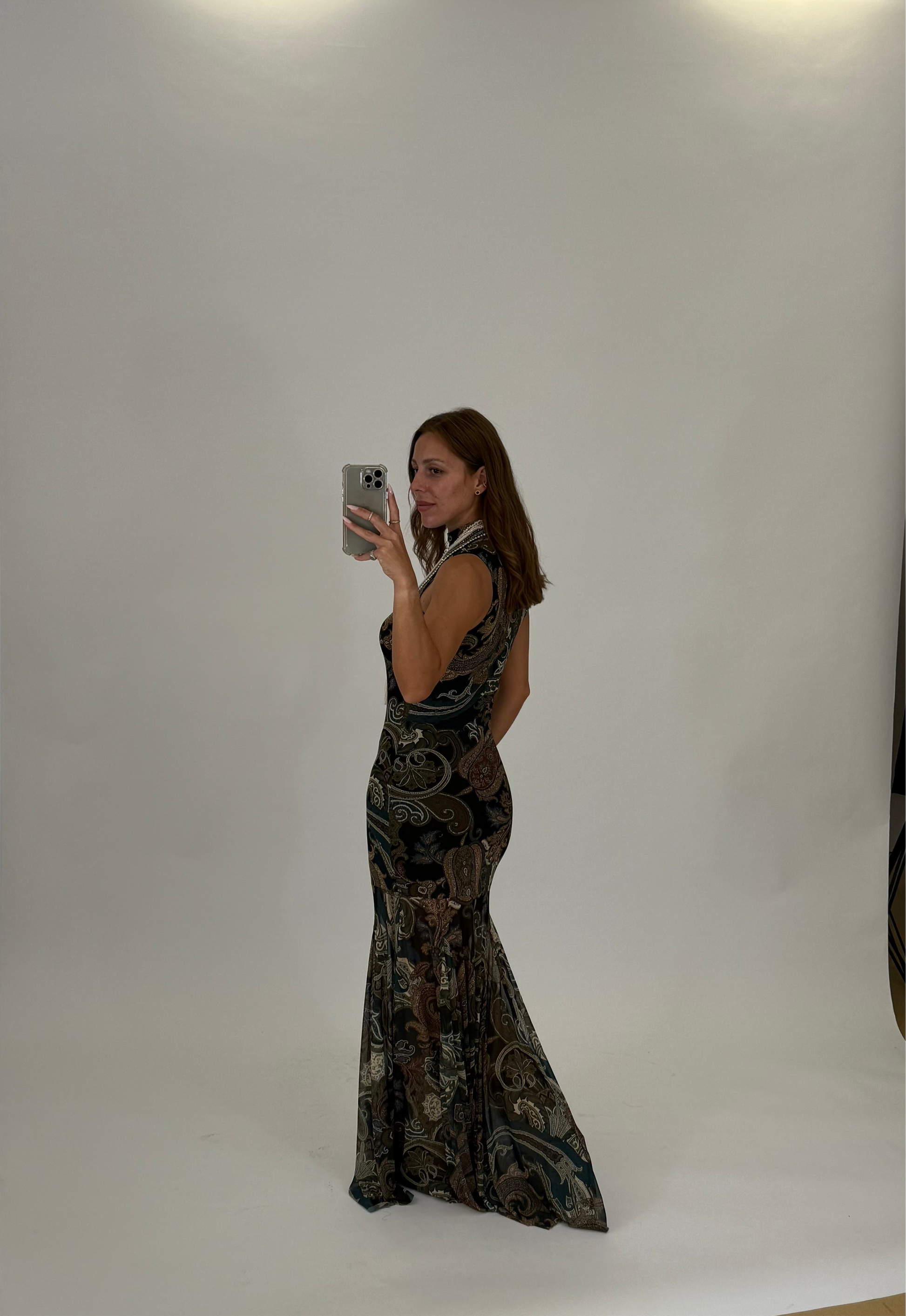 - Abito fantasia Paisley/ Goccia persiana, colletto, balza semi-trasparente sul fondo, elasticizzato