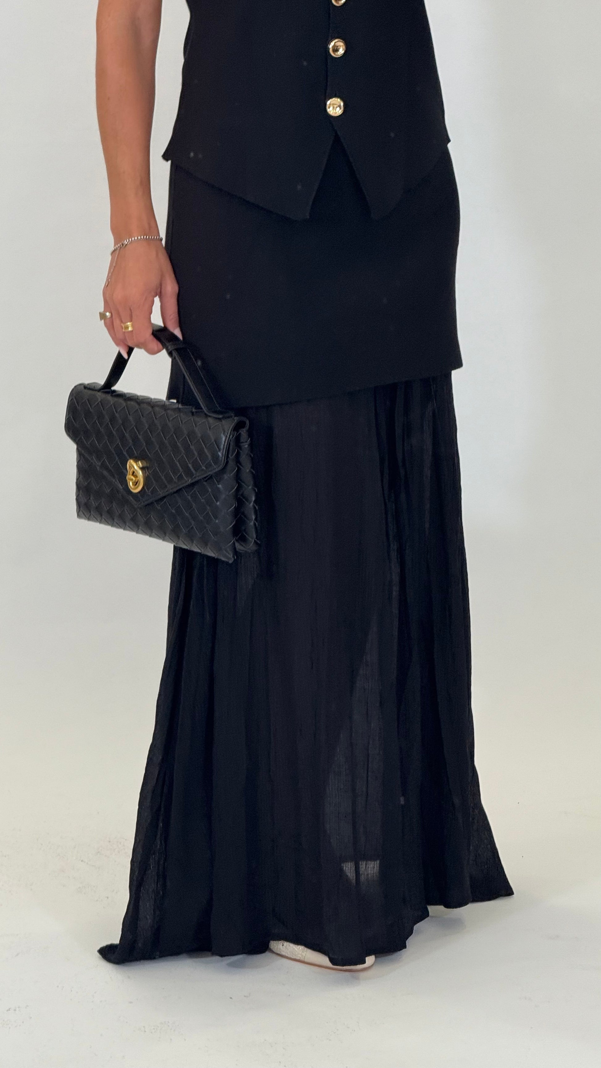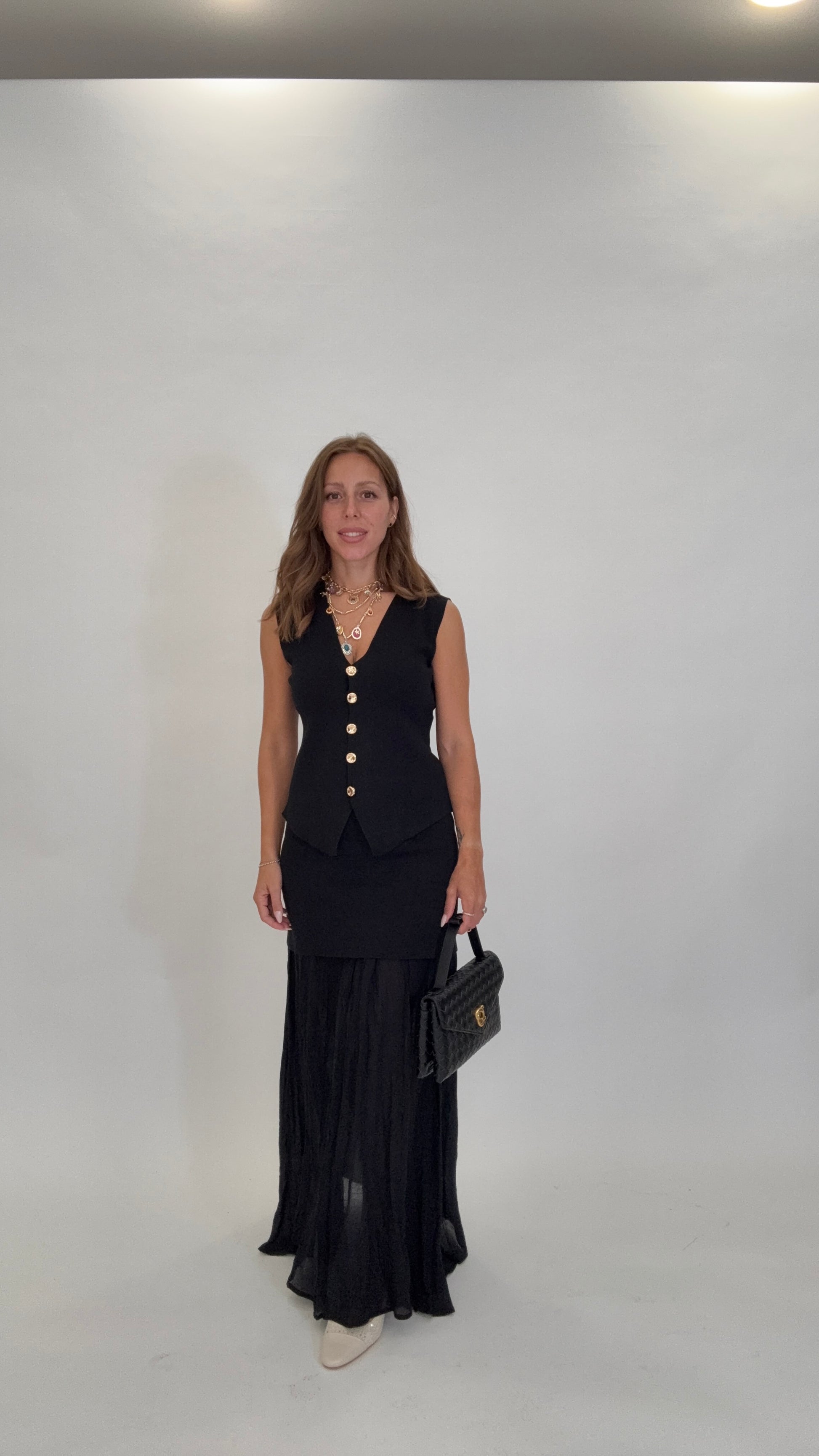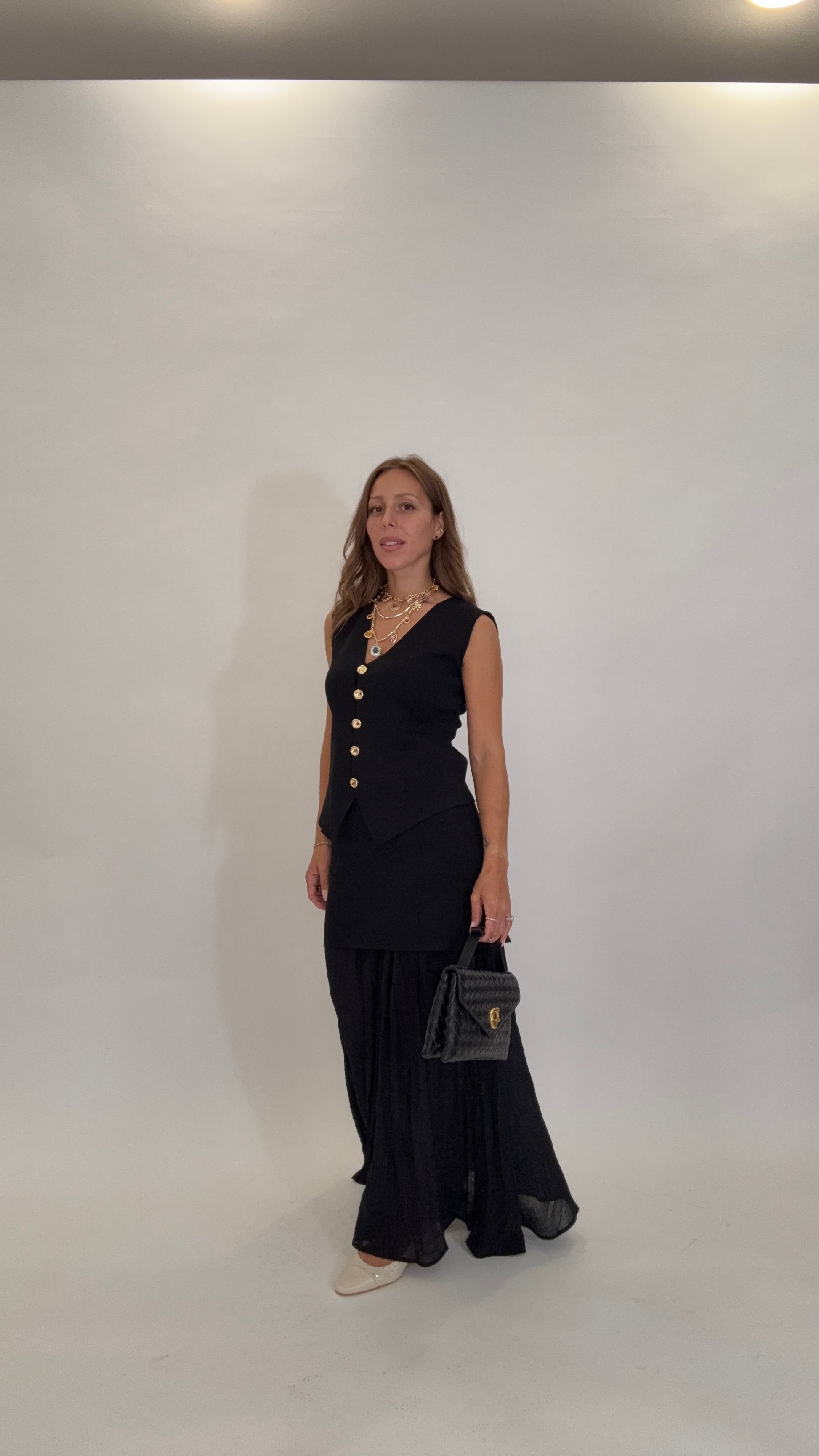 - Coordinato composto da: Gilet smanicato con chiusura bottoni frontali, Gonna in maglia e fondo plissè semi-trasparente, elastico in vita
