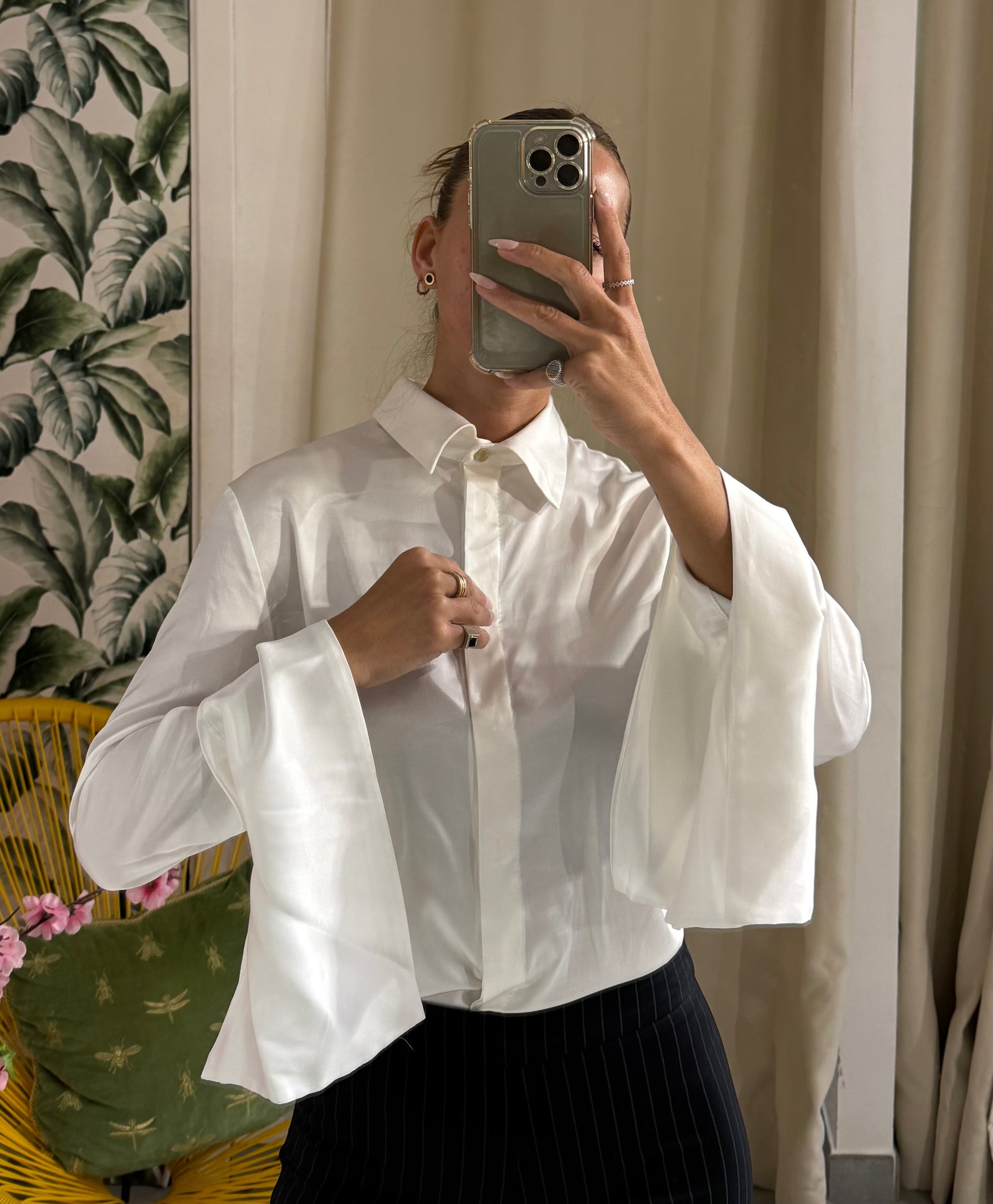- PLEASE MADE IN ITALY. Camicia manica lunga con polsino svasato, bottone di chiusura colletto gioiello, bottoni centrali invisibili